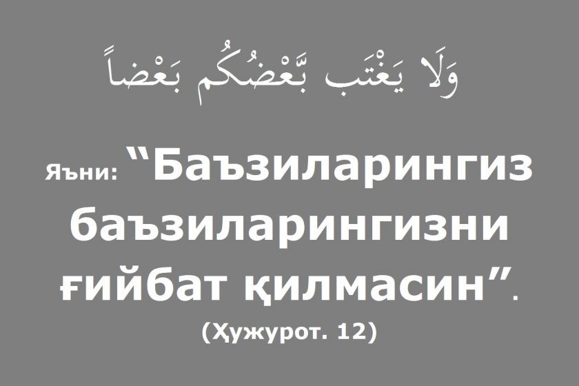 Яъни: “Эй иймон келтирганлар! Кўп гумонлардан четда бўлинглар, чунки баъзи гумонлар гуноҳдир. Жосуслик қилманглар. Баъзиларингиз баъзиларингизни ғийбат қилманглар. Сизлардан бирорталарингиз ўзининг ўлган биродарининг гўштини ейишни яхши кўрадими? Ҳа, ёмон кўрасизлар. Аллоҳдан қўрқинглар! Албатта, Аллоҳ тавбани кўп қабул қилувчи ва раҳмлидир”.